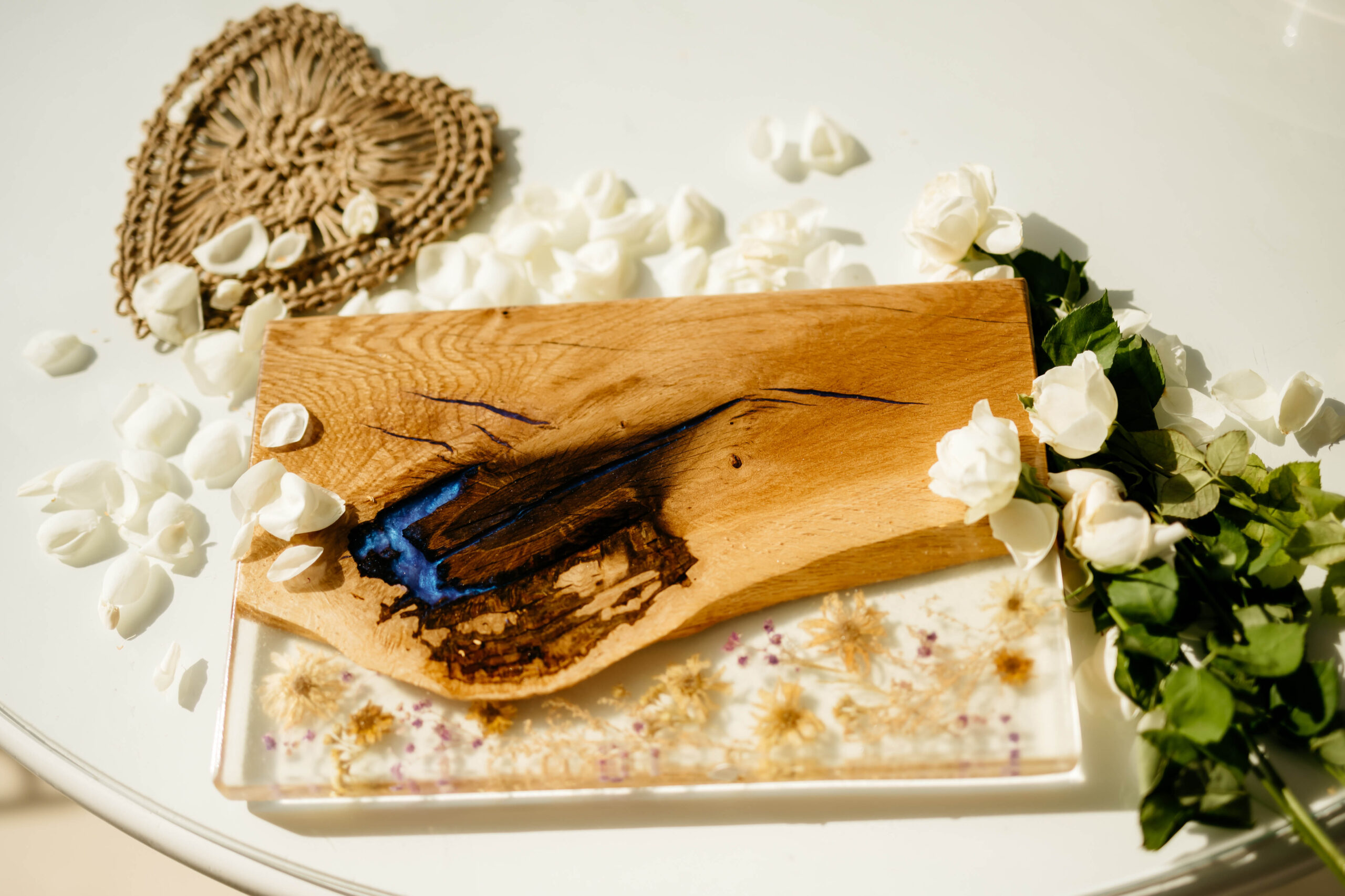 Platoul este realizat dintr-o bucată de lemn atent selectată, care poate prezenta vene și noduri unice, care adaugă caracter și individualitate piesei. Rășina epoxidică, transparentă sau ușor colorată, este turnată deasupra lemnului, umplând golurile și accentuând detaliile naturale ale acestuia. În interiorul rășinii sunt încorporate flori presate sau uscate, care sunt amplasate cu grijă pentru a crea un efect vizual deosebit. Aceste flori pot fi flori de câmp, petale de trandafiri, lavandă sau alte plante delicate, ce își păstrează culorile și formele chiar și după ce sunt încorporate în rășină.